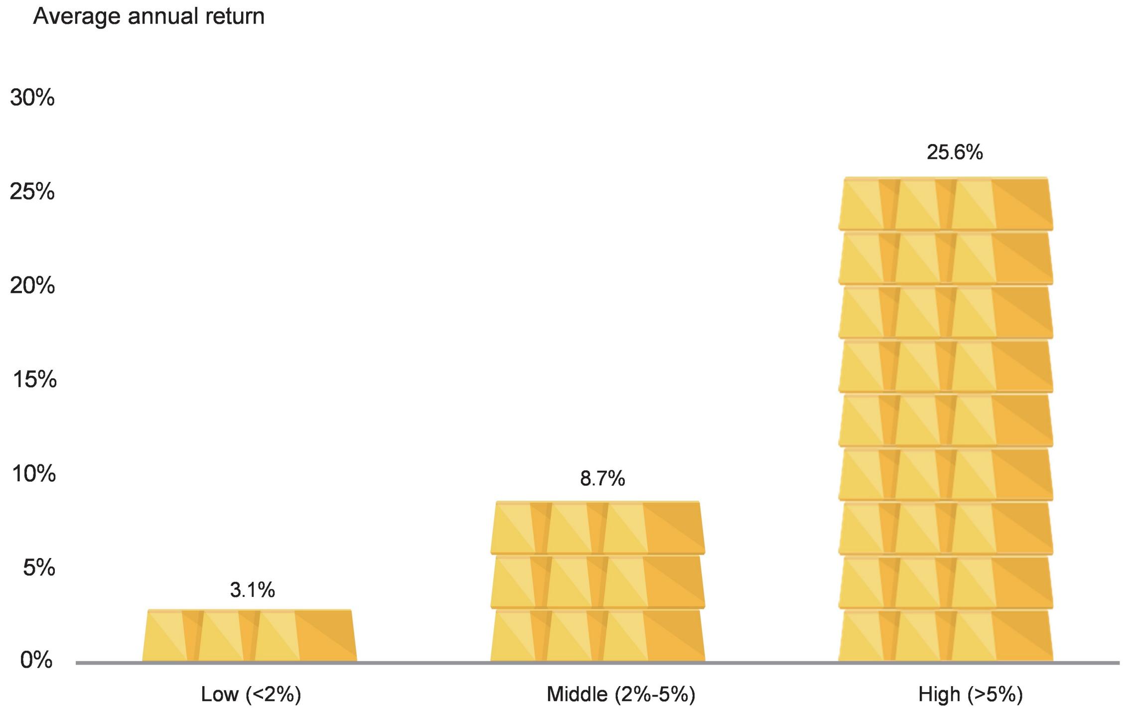 *Based on y-o-y changes of the LBMA Gold Price and US CPI between 1971 and 2025. From 1971 to 2025, there were 13