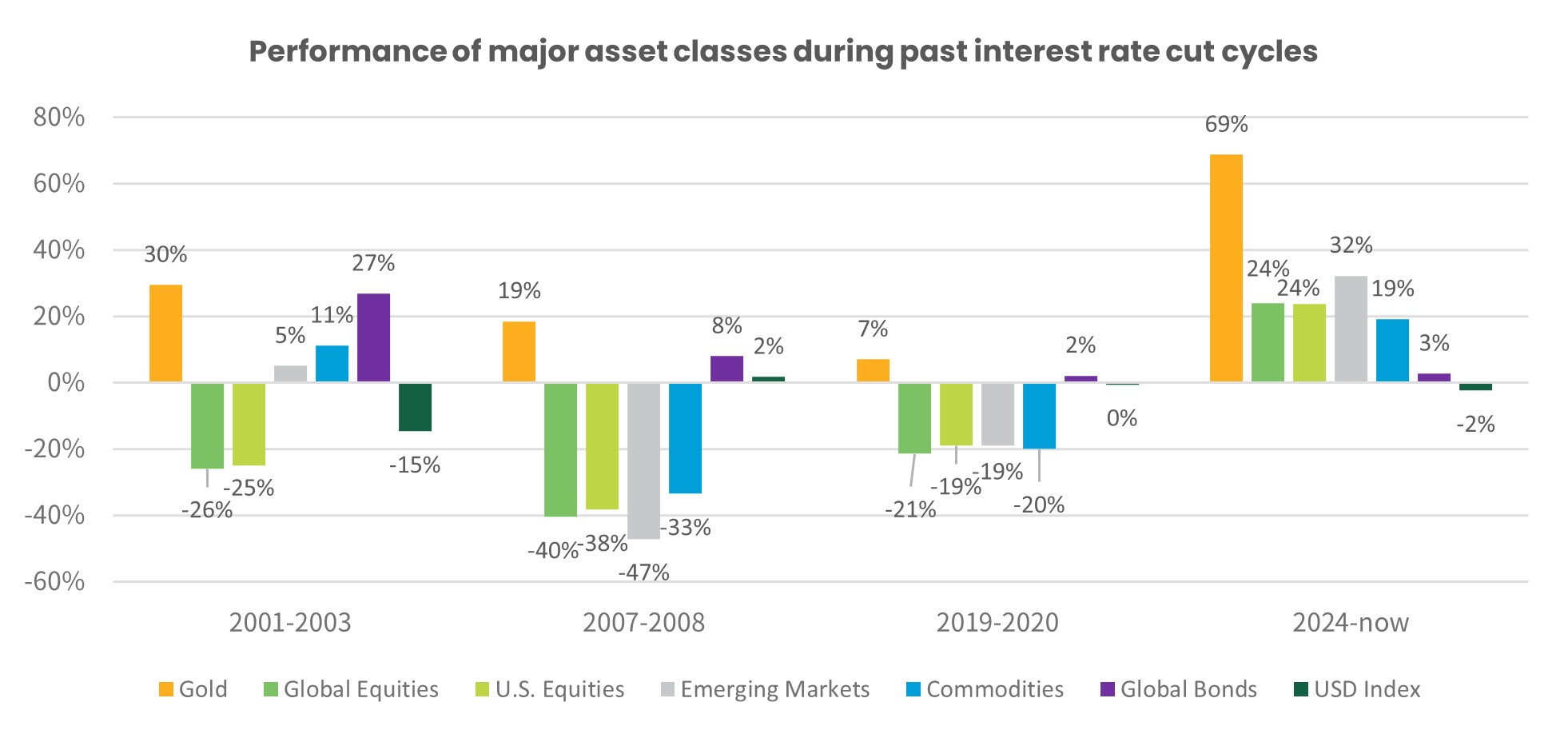 Source: Bloomberg. Returns for the 2001-2003 rate cut cycle were calculated from 3 January 2001 to 25 June 2003. Returns for the 2007-2008 rate cut cycle were calculated from 18 September 2007 to 16 December 2008. Returns for the 2019-2020 rate cut cycle were calculated from 31 July 2019 to 16 March 2020. Returns for the 2024-to-present rate cut cycle were calculated from 18 September 2024 to 31 December 2025. S&P 500 Net Total Return USD Index represents U.S. Equities, assuming dividends reinvested. MSCI Global Net Total Return USD Index represents Global Equities, assuming dividends reinvested. MSCI Emerging Markets Net Total Return USD Index represents Emerging Markets, assuming dividends reinvested. Bloomberg Commodity Dollar Index represents Commodities. The Gold Index (XAU/USD) is based on the spot gold price per troy ounce quoted in US dollars. Bloomberg Global Bond Aggregate US Dollar Index represents Global bonds. Data is for reference only. Past performance is not indicative of future performance.