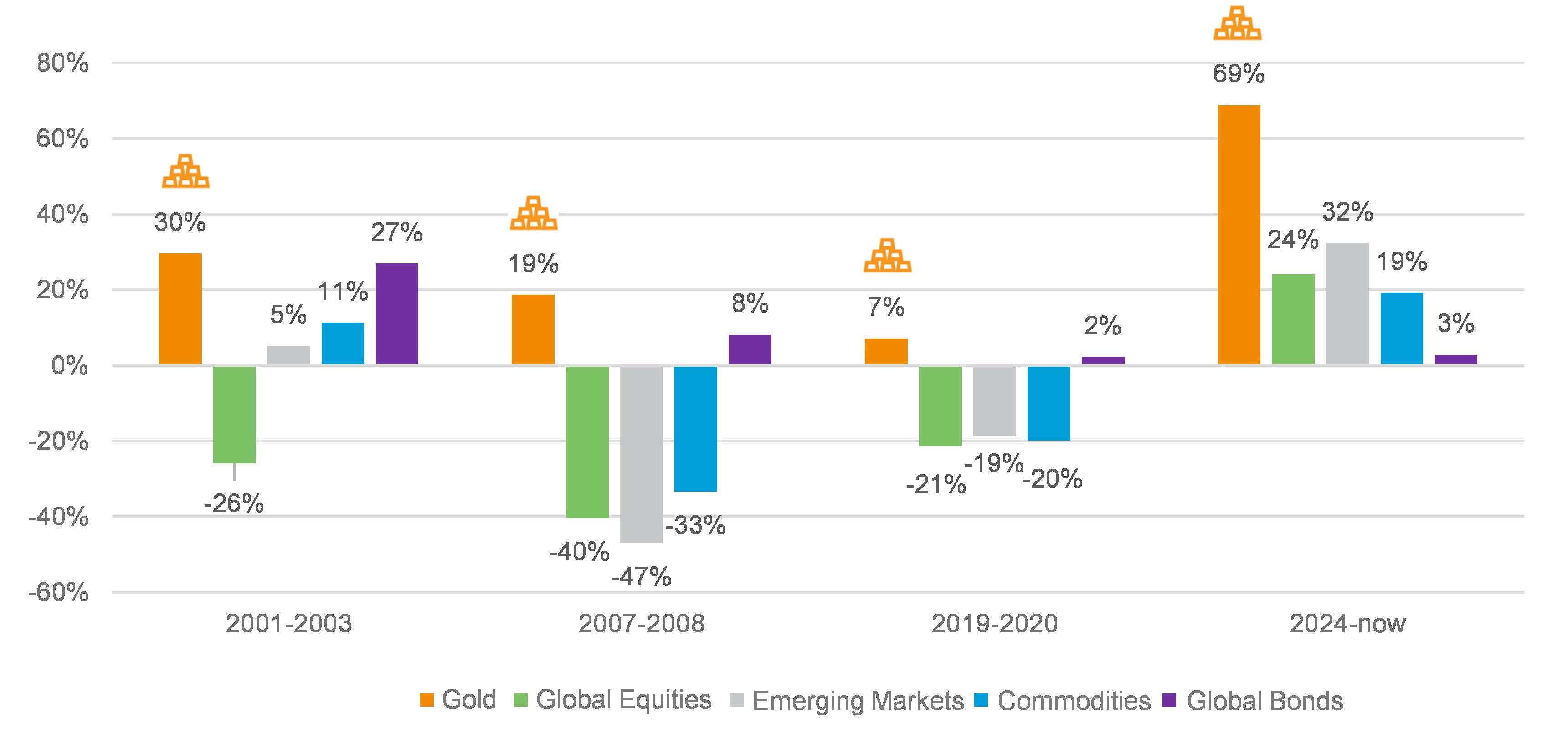 Source: Bloomberg. Returns for the 2001-2003 rate cut cycle were calculated from 3 January 2001 to 25 June 2003. Returns for the 2007-2008 rate cut cycle were calculated from 18 September 2007 to 16 December 2008. Returns for the 2019-2020 rate cut cycle were calculated from 31 July 2019 to 16 March 2020. Returns for the 2024-to-present rate cut cycle were calculated from 18 September 2024 to 31 December 2025. MSCI Global Net Total Return USD Index represents Global Equities, assuming dividends reinvested. MSCI Emerging Markets Net Total Return USD Index represents Emerging Markets, assuming dividends reinvested. Bloomberg Commodity Dollar Index represents Commodities. The Gold Index (XAU/USD) is based on the spot gold price per troy ounce quoted in US dollars. Bloomberg Global Bond Aggregate US Dollar Index represents Global bonds. Data is for reference only. Past performance is not indicative of future performance.