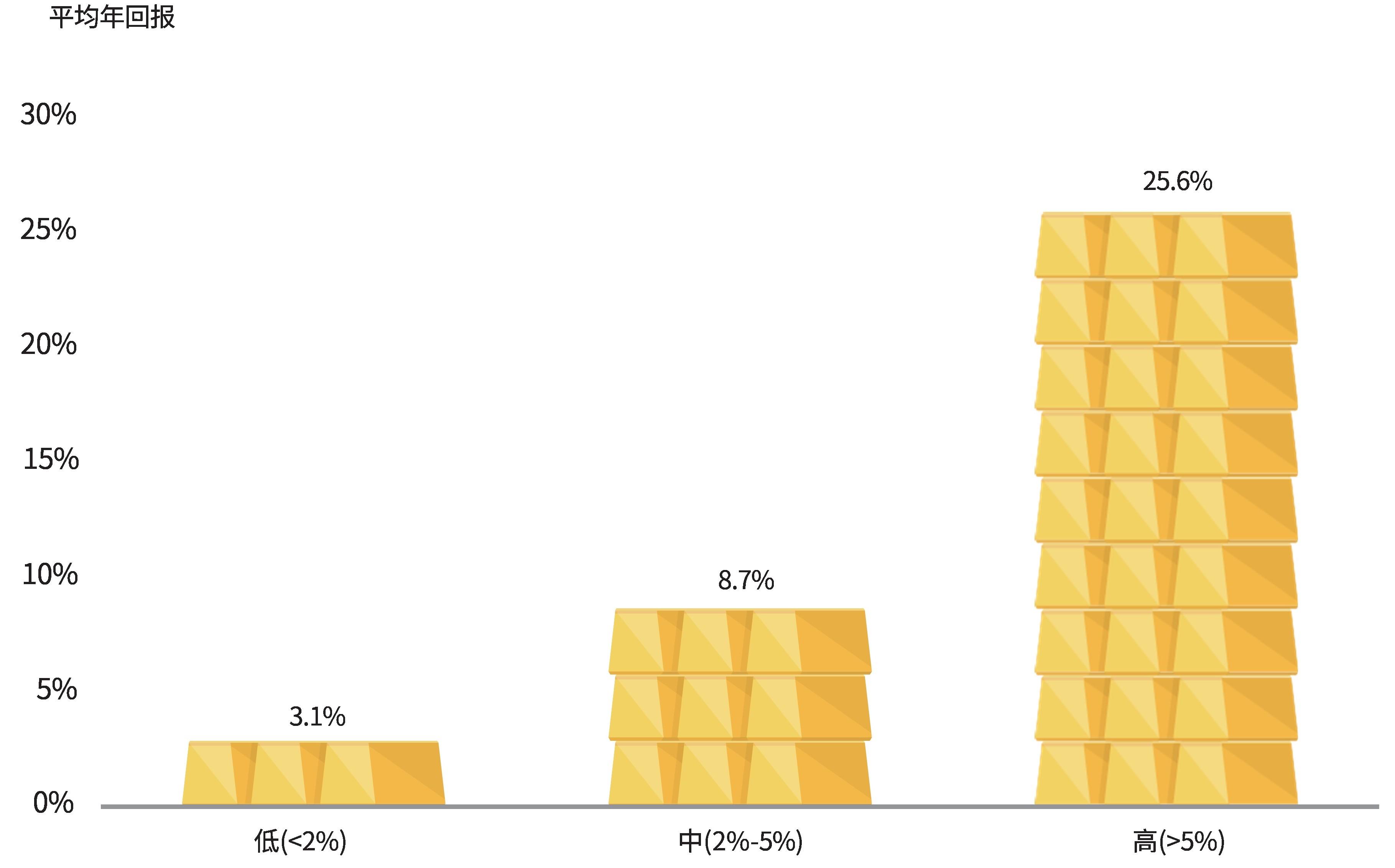 *根据伦敦金银市场协会在1971年至2025年期间的黄金价格及美国消费物价指数的按年变化。1971年至2025年期间,共有13年的通胀是低于2%,30年的通胀是处于2%至5%之间,11年的通胀是高于5%。