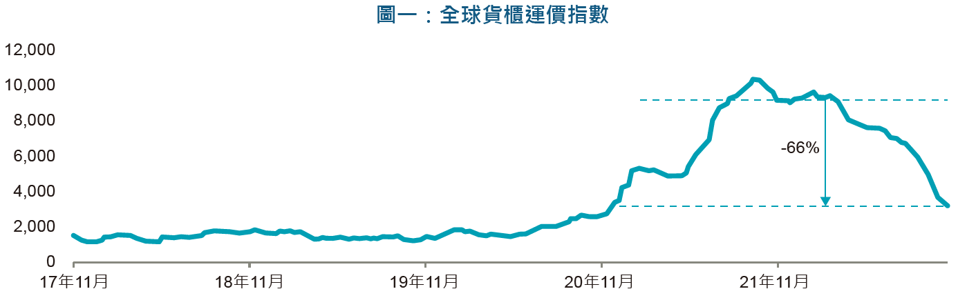 1. 整體通脹 — 供應鏈瓶頸導致商品價格上升,從而成為推動通脹其中一個主因,隨著全球貨櫃運價指數較2021年第四季創下的高位回落66%,該因素對通脹的影響已消除(圖一)。同樣地,商品價格持續放緩,聯合國糧食價格指數亦由一年前的30%增幅大幅降至5%(圖二)。此外,即使石油輸出國組織OPEC+削減原油產量,油價大致保持穩定。上述所有因素正逐步減低整體通脹壓力。