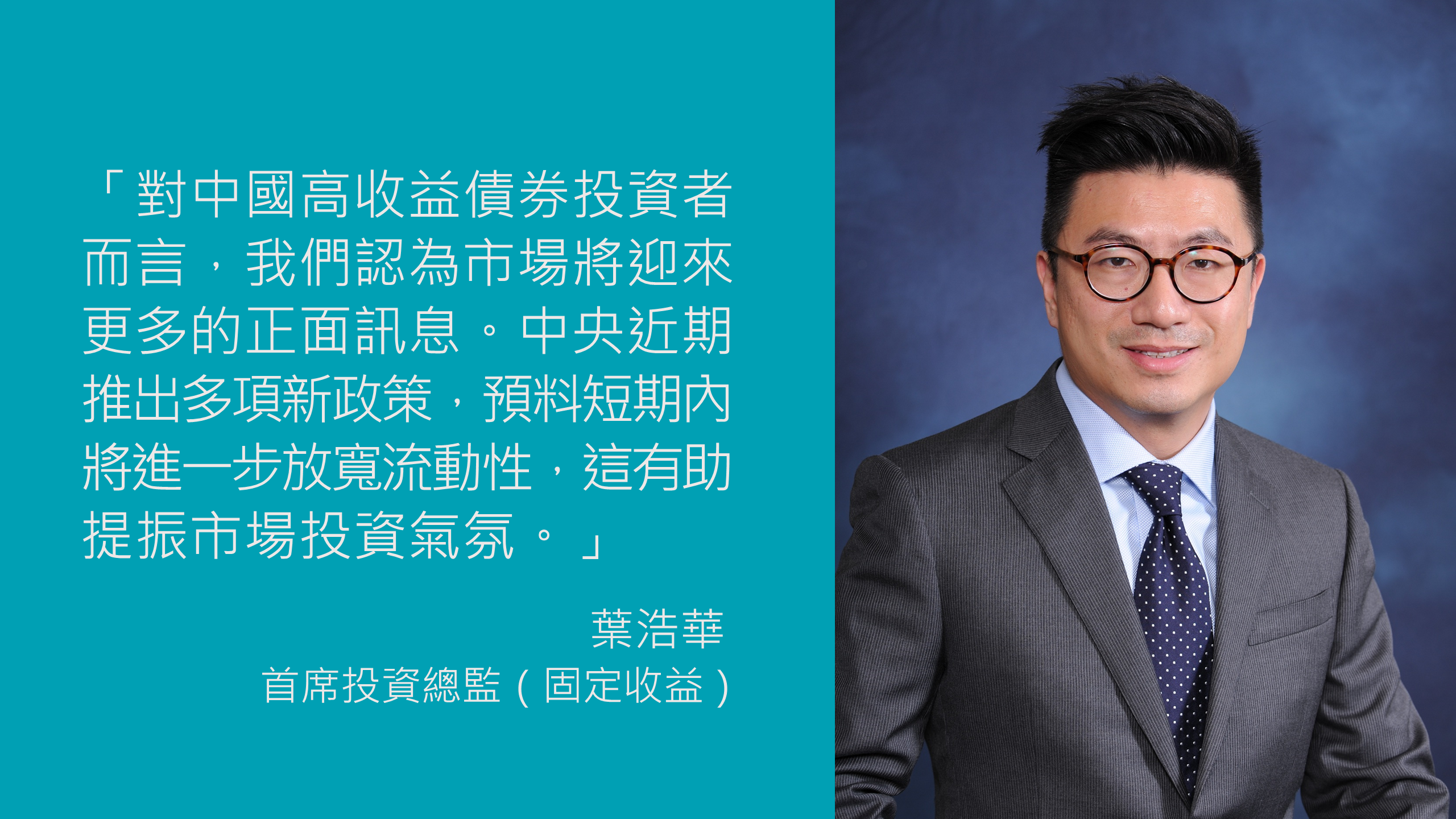 首席投資總監(固定收益)葉浩華表示中央政府進一步放寬流動性及計劃允許中國房地產發展商動用預售資金對中國高收益債券市場來說是正面訊號
