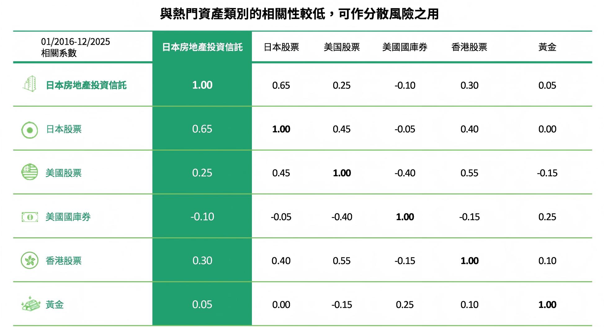 - 該資產類別與其他市場的股票及債券之間的相關性較低, 凸顯日本房地產投資信託基金為投資組合帶來的強大分散投資優勢。
