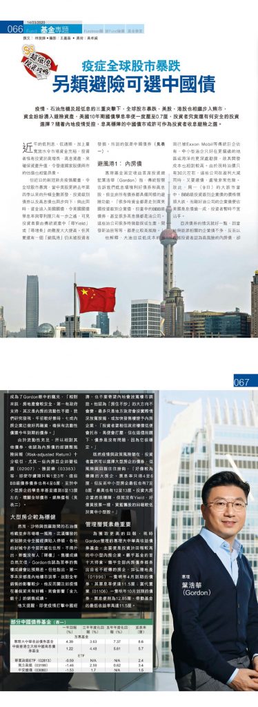 惠理基金固定收益首席投資總監葉浩華(Gordon)近期接受《iMoney智富雜誌》訪問時指,通常低息環境利好債券和高息股,但並非所有的債券都具備同樣的避險功效。他認為,隨着內地疫情受控,息高穩陣的中國債市或許可作為投資者收息避險之選。