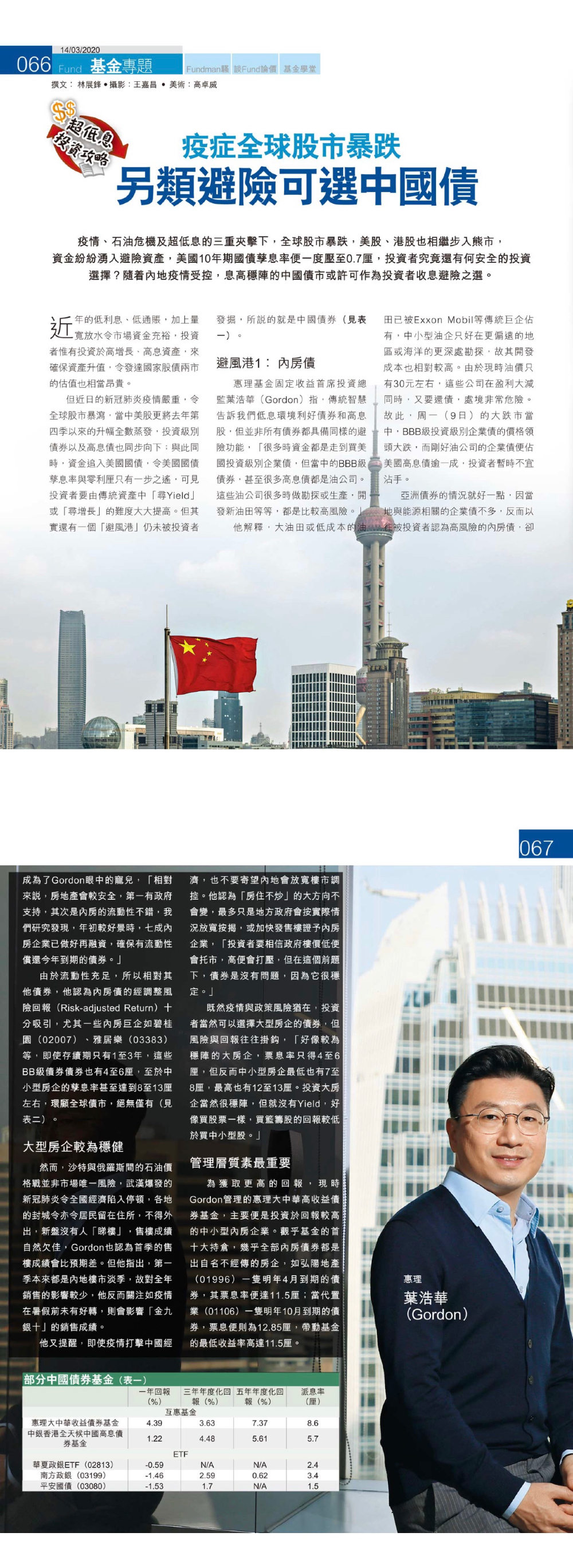 為獲取更高的回報,現時Gordon管理的惠理大中華高收益債券基金,主要便是投資於回報較高的中小型內房企業。在進行基金選債時,他最看重管理層質素。
